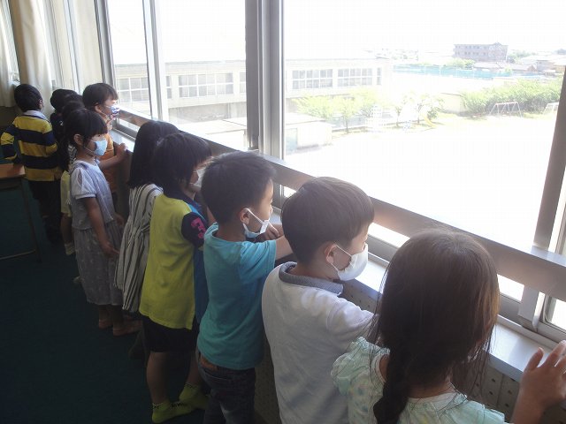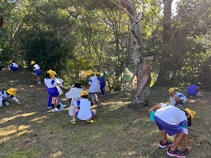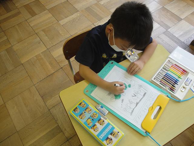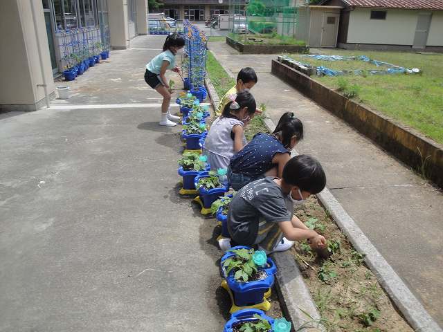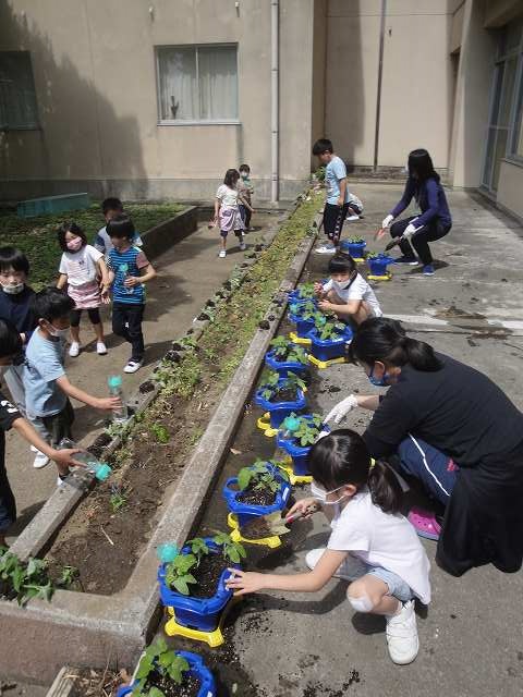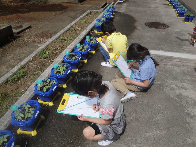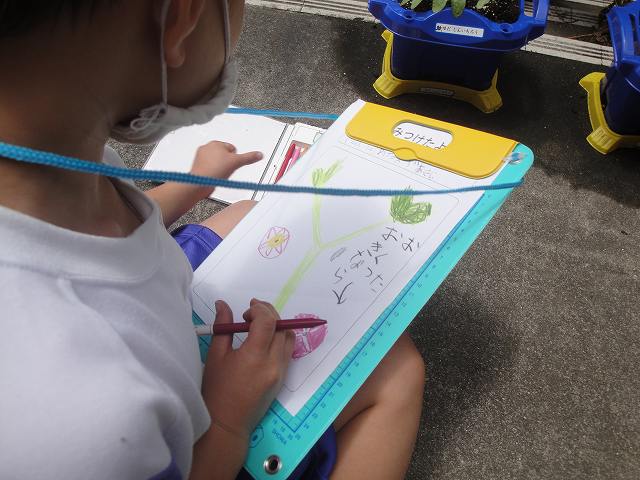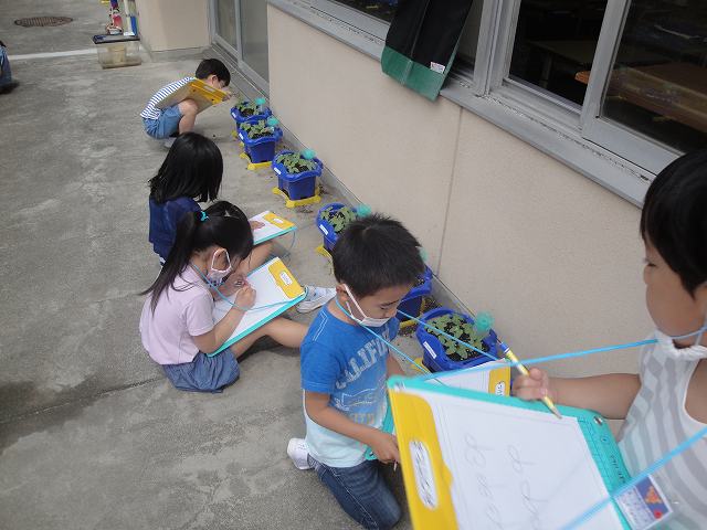アサガオの双葉が出たので、みんなで観察をしました。自分の鉢の前で一生懸命に絵を描く姿がみられました。子どもたちは、「いっぱい めが でたよ!」「はっぱに しわが あるよ!」など、見つけたことを嬉しそうに教えてくれました。