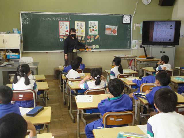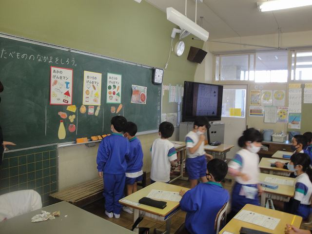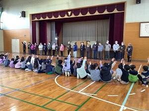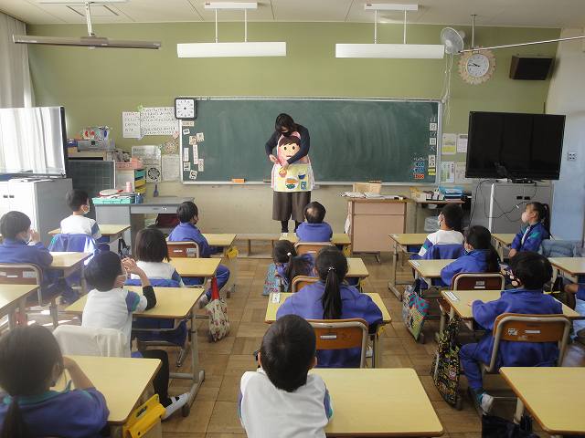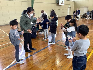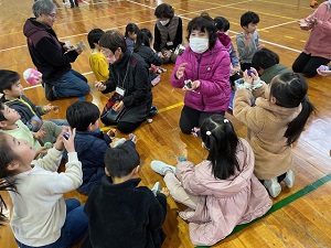 「ふれあい長寿津」のメンバーの方々に来ていただき、「昔の遊び」を教えてもらいました。 「けん玉・あやとり・こま回し・お手玉」の4グループに分かれ、おじいさん、おばあさん達に優しく教えてもらい、コツをつかんだ1年生は、とっても楽しそうに遊んでいました。 終わりの会で子どもたちから、「今日は、楽しかったです。」「おじいちゃん、おばあちゃんに優しく教えてもらったから、できるようになって、うれしかったです。」など、一緒に遊んでもらって楽しかった感想がたくさん出ていました。
