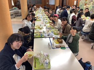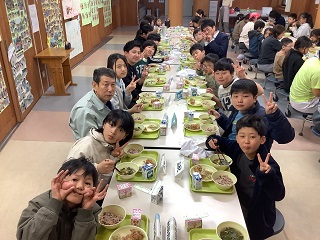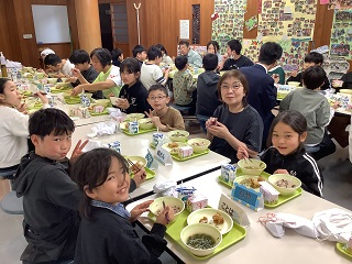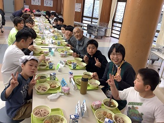 給食最後の日。みんなでランチルームで食べました。6年生の卒業お祝いです‼‼
