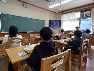 給食を食べるのと、お話を聞くので大忙しい。