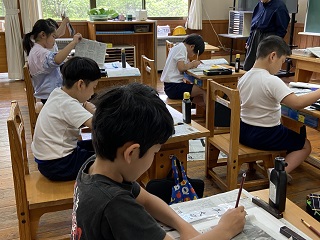 書写の時間、真剣な筆づかい、小筆で名前書いてみました。