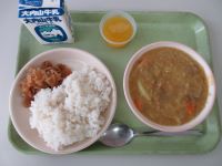 今日のメニューは、子どもたちに人気のカレーライス(福神漬け)と手作りみかんゼリーでした。