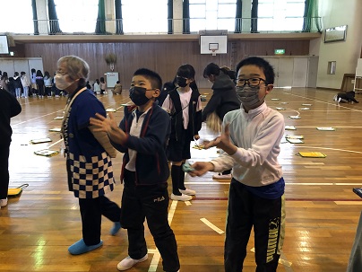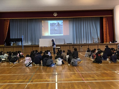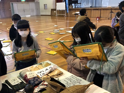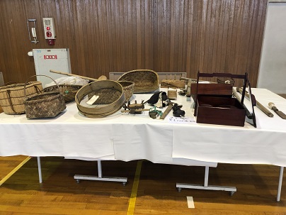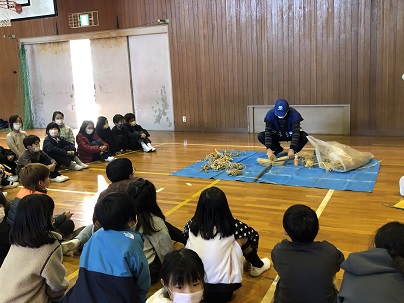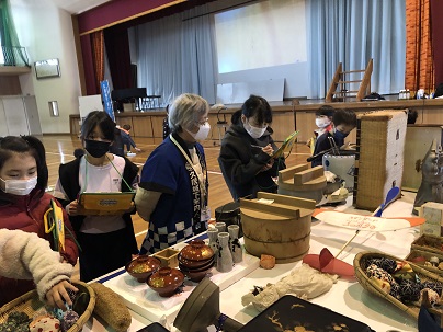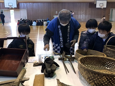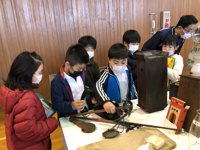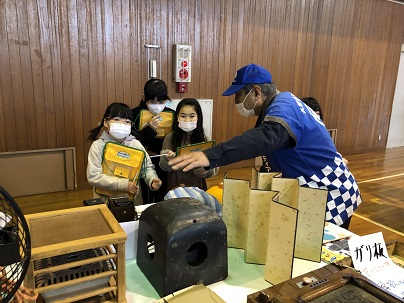 3年生は、久居城下案内人の会のみなさまから、むかしのくらしや道具について教えていただきました。むかしのくらしのお話のあとは、大正から昭和初期の生活道具などの説明を聞いたり、お手玉やこま、藁で作った縄で遊んだりしました。初めて見る貴重な道具ばかりで子どもたちは興味しんしん!たくさん質問し記録していました。
