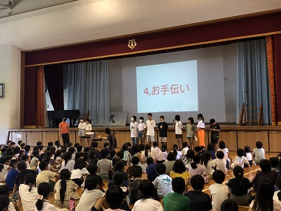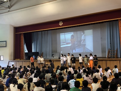 終業式後の児童集会で、児童会の子どもたちが、夏休みの過ごし方に