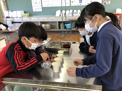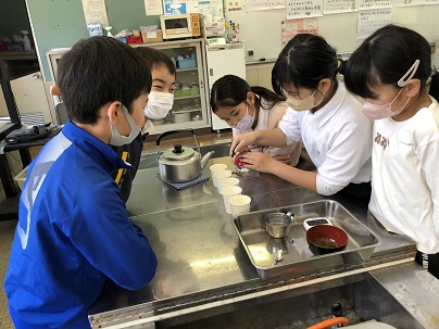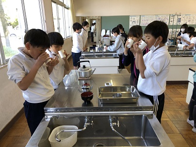 5年生からはじまる家庭科。子どもたちの楽しみはやっぱり実習です。はじめての実習は、お茶の入れ方です。友だちが見守る中、ていねいにお茶を入れていました。自分たちで入れたお茶の香りと味は格別です!「いい香りがするなあ」「いつもよりおいしい」と嬉しそうに飲んでいました。
