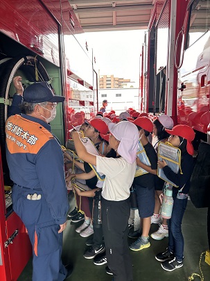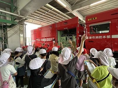 今日は3年生の社会見学。おやつタウンと津市久居消防本部に行きました。