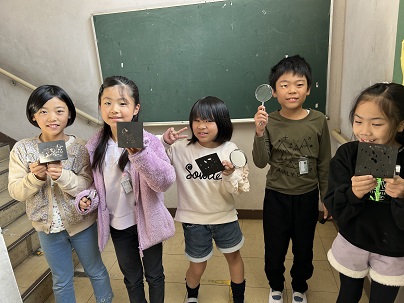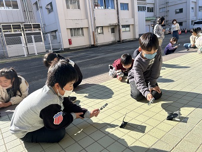 3年生は、太陽の光を虫眼鏡で集める実験をしていました。黒い紙に虫眼鏡をあてて、紙や虫眼鏡の角度をいろいろ試しながら光を集めていました。光をあてていると、けむりがモクモク出てきて紙に穴があきました。安全には十分気をつけ、楽しく実験しました。