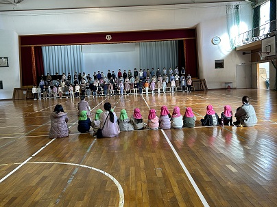 のむら幼稚園の子どもたちが、1年生のハッピースマイル集会の練習を見に来ました。毎日、体育館で練習している1年生の声や歌声が幼稚園まで聞こえていたようで、幼稚園の子どもたちは興味いっぱいだったそうです。幼稚園のお友だちの前で、みんな素敵な歌を聞かせてくれました。