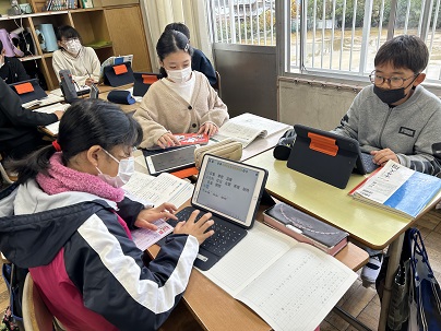 漢字辞典、漢字ドリル、タブレットを使って熟語を学び合っていた6年生。
