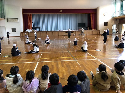 はじめに、すべての学年の授業を廊下から参観しました。体育館では、なわりんぴっくの記録更新に向けがんばっている2年生を参観しました。参観後は、図書室で本を読み、休み時間は運動場で思いきり遊びました。