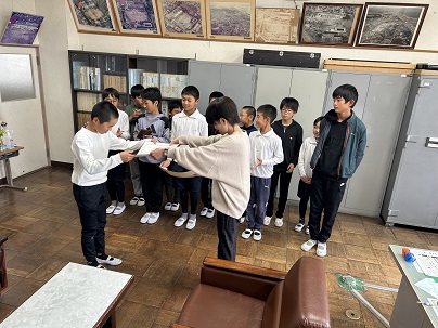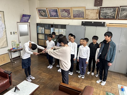 野球でがんばっている子どもたちを表彰しました。6年生と一緒に出場できる最後の大会でみごと優勝!校長室での表彰式でも、みんなピシッときめてくれました。