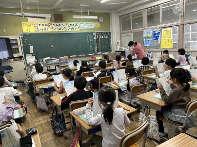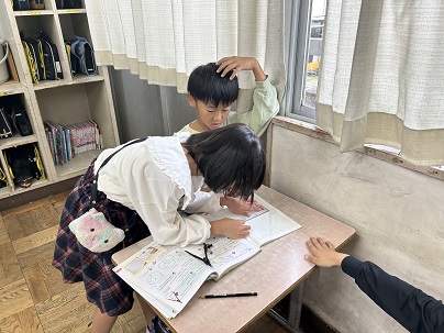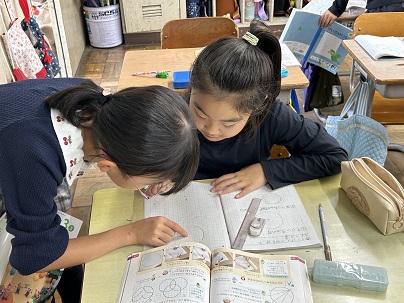 1年生は「くじらぐも」の音読。上手に読めるようになってきました。3年生はコンパスで円をかく練習です。コンパスの使い方のコツを友だちに伝えていました。教え方名人がいっぱいです!