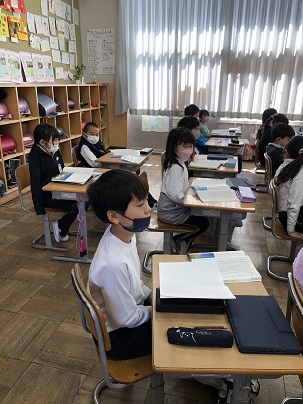 3年生の外国語活動の授業では、海の生き物あてクイズをしていました。ALTの先生と楽しく英語を学んでいました。友だちの発表を聞く2年生の姿勢が抜群で、思わずパチリ!次の学年に向けて、どの学級もがんばっています。