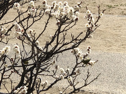 とても温かい日になりました。学校の梅の花が、いまきれいに咲いています。その梅の木に、メジロがつがいでやってきました。もう春です。