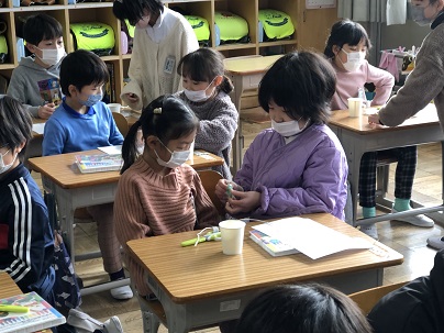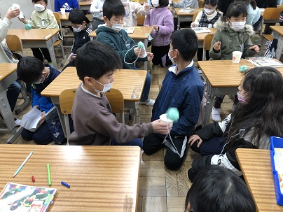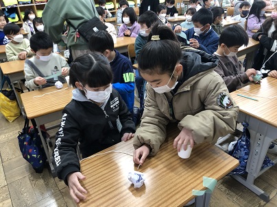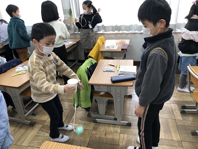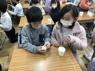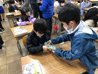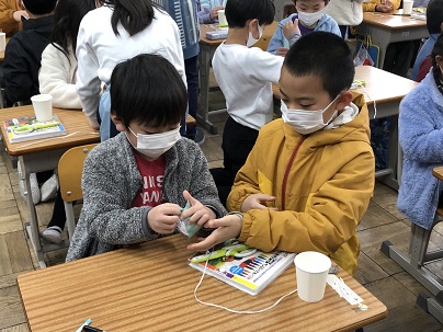 2年生が1年生にけん玉の作り方を教えてくれました。