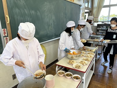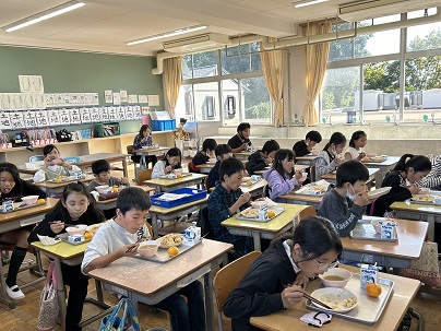 今日の給食は、げんまいだんごじる、ふきよせご飯、みかん、牛乳でした。食缶の中は空っぽです。おいしくいただきました!
