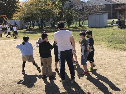 昼休み、先生と一緒に遊ぶ子どもたち。元気な子どもたちに、先生も