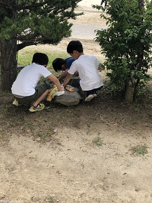 今日の20分休みの時間、校長室に子どもたちの楽しそうな声が聞こえてきました。窓から外を見てみると、2年生の子どもたちがダンゴムシ探しをしています!ダンゴムシは湿ったところにいるらしく、校長室前の木の下を一生懸命探していました。ダンゴムシは子どもたちの人気者です!