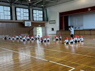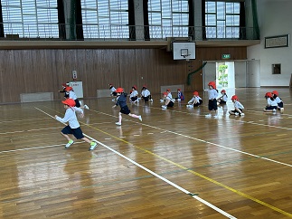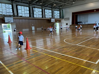 1年生の体育、いい姿勢で先生の話を一生懸命聞き、リレーに挑戦。コーンをまわって自分のチームの友だちにタッチしてつないでいきます。どの子も笑顔で走っている姿がとてもすてきでした!