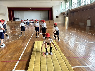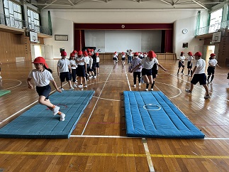 体力テストの立ち幅跳び練習中の4年生。うでの振りとジャンプのタイミングを合わせることが難しいようです。