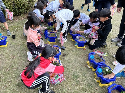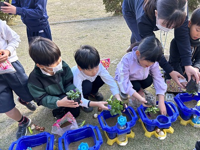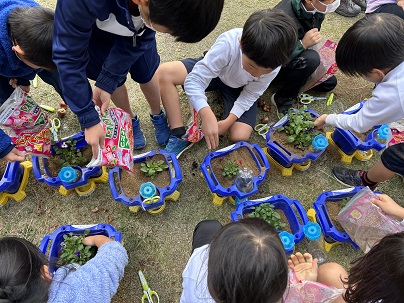 1年生は、1学期にアサガオを育てた植木鉢に、チューリップの球根とビオラの苗を植えました。花が咲くころ、新しい1年生が入学します。みんな、もうすぐ2年生だね!
