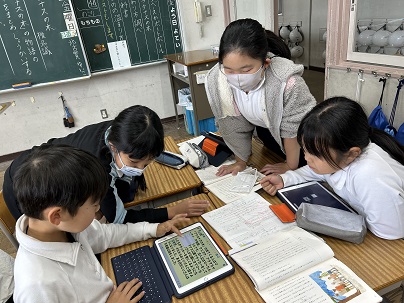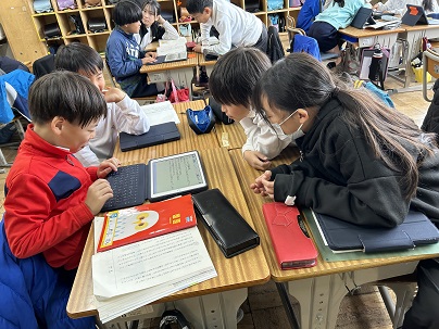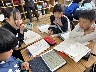 4年生は、物語「プラタナスの木」の魅力をまとめ、紹介する文章をつくっていました。短い文章でいかに魅力を伝えるか・・グループで知恵を出し合い考えていました。友だちと考え合うと学びも深まります。