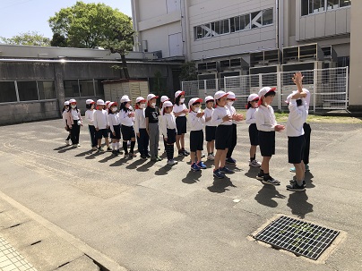 2棟の玄関前で。体育の授業のため運動靴にはきかえた2年生、先生がいなくても、自分たちで声をかけ合いながら並んでいました。ふとした場面に子どもたちの成長を感じます。