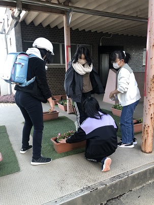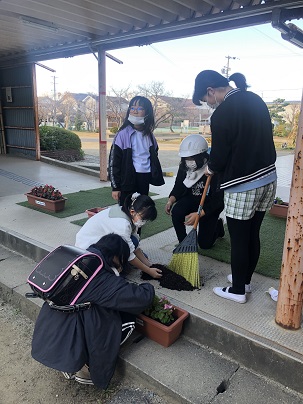 今日の朝、登校した低学年の子が体育館通路に置いてあるプランターにぶつかってしまいプランターの土がこぼれてしまいました。すると、そばにいた4年生と5年生の子どもたちが、「けがしなかった?」と声をかけ、土をプランターの中にもどしてくれました。温かい優しさに朝からほっこりです♡