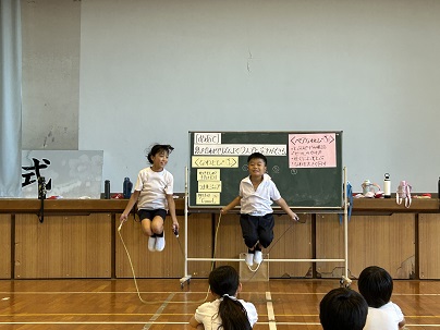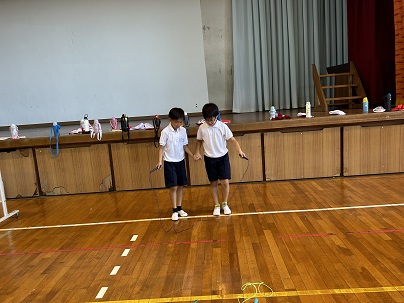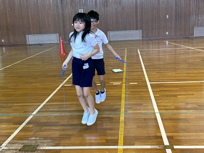 今日の4年生の体育は教育実習生が授業を行いました。子どもたちは、ペアになり、いろいろななわとびのとび方に挑戦しました。協力してたくさんの回数がとべるよう知恵を出し合っていた子どもたち!手をつないでとんでみたり、二人でかけ声を合わせたり!45分でとても上手になりました。