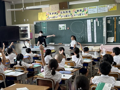 1年生は国語で物語文の「やくそく」を学習しています。葉っぱを取り合ってけんかをしていたあおむしたちが、ちょうになったらひかっているところに一緒にとんでいくやくそくをするというステキなお話です。子どもたちは、あおむしの気持ちを考えながら、文をどのように読もうか意見を出し合い楽しく音読していました。