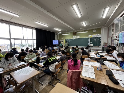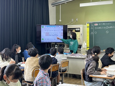 6年生の算数は比例の学習のまとめでした。私が授業をのぞいた時は、班活動後の全員で共有する場面でしたが、全員で共有する前に、各班でめあてを決め、班の友だち同士で考え合う活動をしていたそうです。子どもが学ぶ授業です。