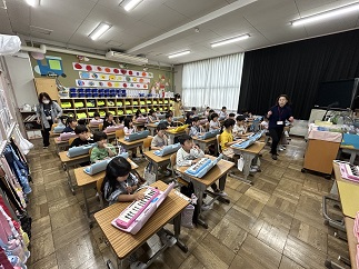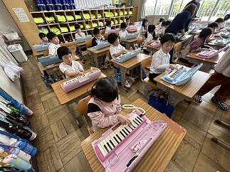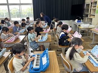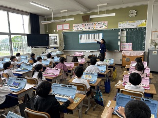 1年生は、講師先生をお招きし、けんばんハーモニカの置き方、扱い方、吹き方など教えていただきました。指の置き方や息の入れ方の話を一生懸命聞き、楽しく音を出しました。音楽の授業がますます楽しみになったようです!
