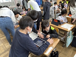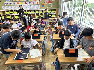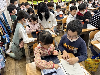 今日から5月。朝、1年生にタブレットをわたしました。これから1年生も学習でタブレットをつかいます。そのために、つかい方を6年生に教えてもらいました。1年生が自分で操作できるように、ていねいに教えていた6年生。さすがです!