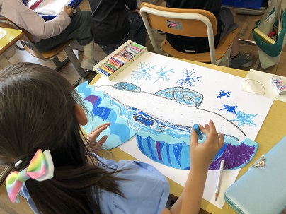 2年生の図工。たまごから生まれてくるものを想像して、たまごのがらや生まれてくるものをかきます。子どもたちが想像した生まれてくるものは楽しいものばかりです!