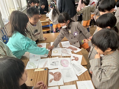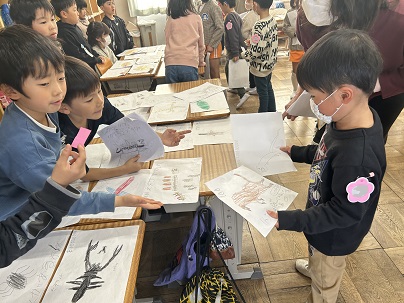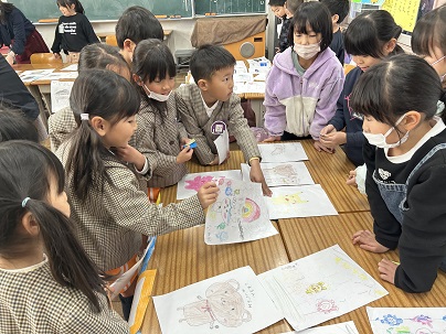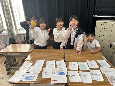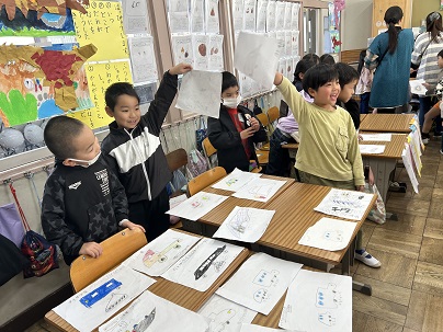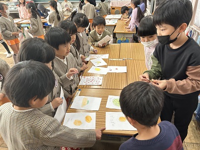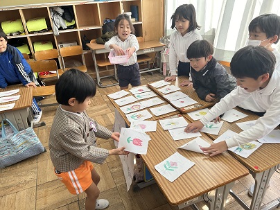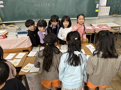 NOBENOこども園とのむら幼稚園の子どもたちが、1年生のお店やさんに買い物に来てくれました。お花やさん、ケーキやさん、ピザやさん、自動車やさん、文房具やさん、電気やさん、化石やさん、楽器やさん・・1年生が考えた楽しいお店がたくさん並んでいます!「今日のおすすめ自動車はスポーツカーですよ!」「おいしいケーキがたくさんあります!」と声かけも上手です。小さいお友だちに喜んでもらいたい気持ちいっぱいの1年生。みんなの気持ちはしっかり伝わり、とても楽しんでもらいました!