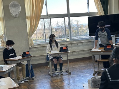 自分たちの身のまわりや社会にある人権課題について話し合い、自分の考えを深め合う子ども人権フォーラムが久居東中学校でありました。久居東中学校区の中学1年生と小学6年生の代表が中学校で参加し、他の子どもたちは各学校でZoomでの参加です。