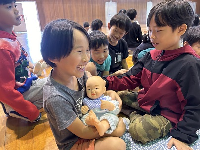 2年生のいのちの授業。赤ちゃんの成長や誕生のお話を聞いたあと、赤ちゃん人形をだっこしました。「かわいいなあ」と言いながら、大切にだっこしていました。あなたたちも、こんなに小さかったんだね。いま、みんなに会えて、とてもうれしいです。