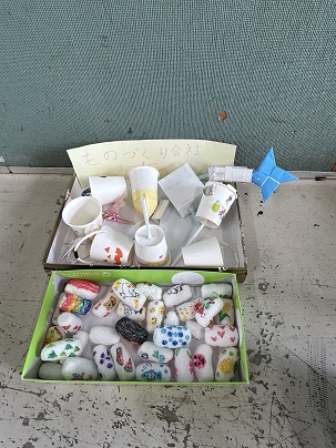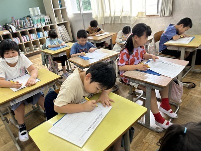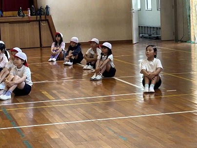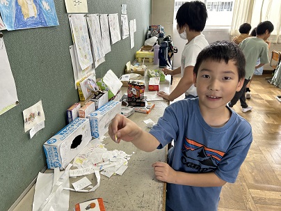 2年生の体育、話を聞く姿勢がとてもよく、真剣に聞いていることが分かります。すばらしい!2年生の違う学級は図工で、カッターナイフで切る練習中でした。集中して丁寧に紙を切っていました。教室のうしろには、会社活動で作成した楽しそうなゲームがたくさん置いてあり、壁にはマンガや魚の絵が掲示してあります。友だちを楽しませたい気持ちいっぱいの2年生です!