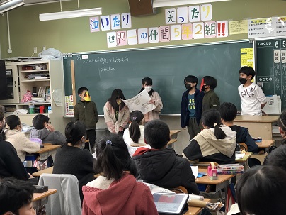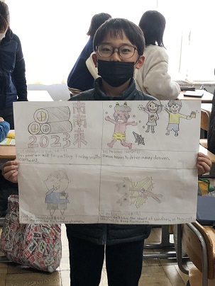 5年生の英語の時間、子どもたちがALTの先生に節分を英語で伝えようとがんばっていました。ポスターにしたり豆や鬼のお面を作ったり、どの班も工夫いっぱい!ALTの先生に節分のことを分かってもらえたようです。