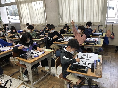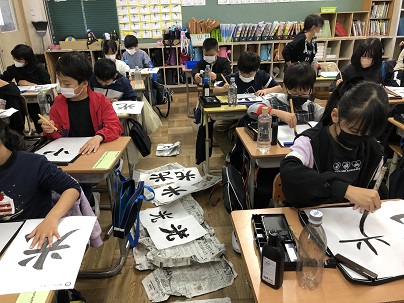 3年生の書写の時間。はねやとめ、はらいに気を付けながら、丁寧に練習しています。丁寧に書かれた字から、心ををこめて書いた字であることが伝わってきます。