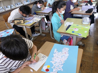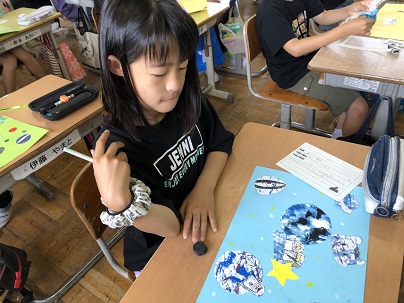 4年生の図工では、いろいろな技法をつかって絵の具で模様をつくりました。ビー玉に絵の具をつけてころがしたり、絵の具をつけた筆をふってみたり、うすく溶いた絵の具をストローで吹いてみたり・・できた模様を生かしながら切ったり貼ったりして絵にしました。おもしろい作品がたくさんできました!