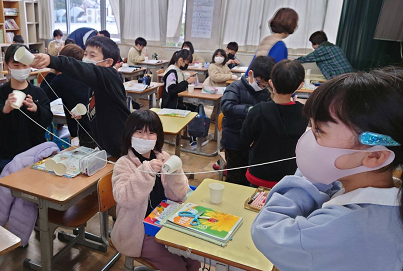 1年生の音読では、とても姿勢よく、一人一人しっかり読んでいました。はじめて読む場面だったそうですが、とても上手でした!3年生の理科では、音の伝わり方を糸電話をつかって考えていました。実際に自分で体験し考える大切な学びです。