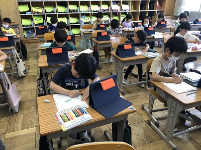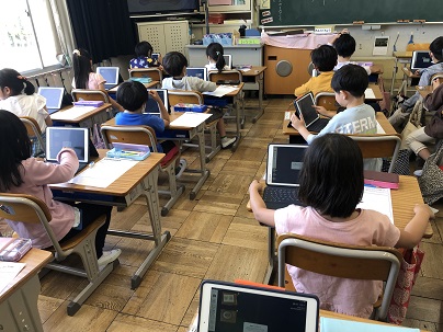 1年生の子どもたちも、学習でタブレットを使うようになりました。自分で撮影したアサガオの芽の写真を見ながら観察日記を書きます。子どもたちは、タブレットの画面を大きくしながら、細かいところまでよく見ていました。