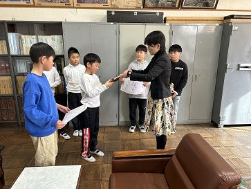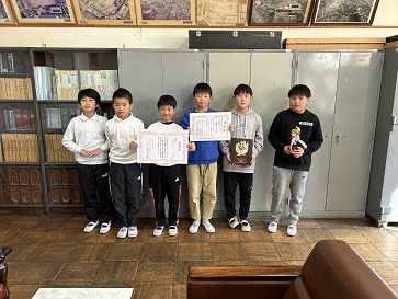 バレーボールをがんばっている子どもたちを表彰しました。低学年からチームに所属し練習を続けてきたそうです。練習の積み重ねは成果につながっています。次の目標は県大会。応援してます!