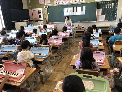 1年生の音楽。鍵盤ハーモニカ専門の先生を招聘し、鍵盤ハーモニカの使い方と吹き方を教えていただきました。先生の話をしっかり聞いて、一生懸命練習した1年生♪「すばらしい子どもたちですね!」とほめていただきました。