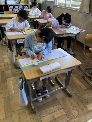 2年生は、とてもいい姿勢で漢字の練習をしていました。いい姿勢でていねいに書いた字は抜群に上手でした。