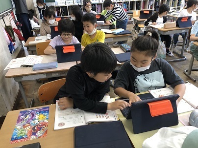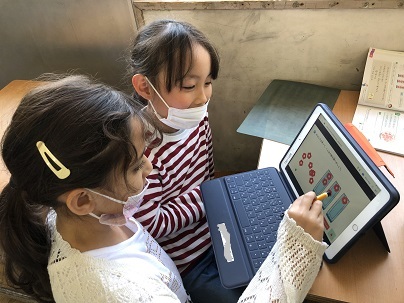 3年生の算数はわり算の学習。タブレットをつかい、友だちと同じ数ずつ分ける方法を考えました。友だちと考えると楽しく考えが深まります。