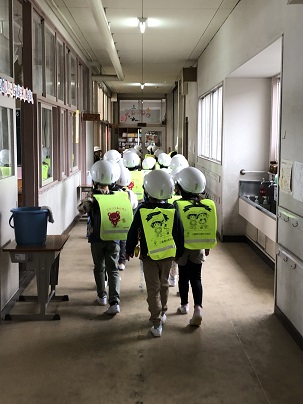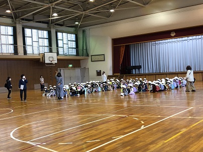 3限目の通学団集会がはじまる前、体育館まで1年生を上級生が迎えに来て、地区の教室まで連れていってくれます。体育館をのぞいてみると、1年生の子どもたち、とても上手に待っていました!