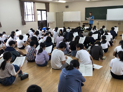 5年生の学年集会では、学校で楽しく過ごすために決まりなどをみんなで確認していました。5年生担任団みんなで5年生の子どもたちを見ています。
