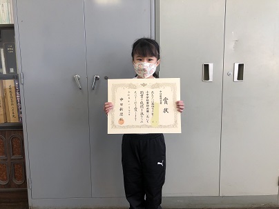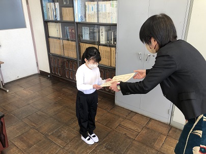書初めで賞をもらった1年生を校長室で表彰しました。
